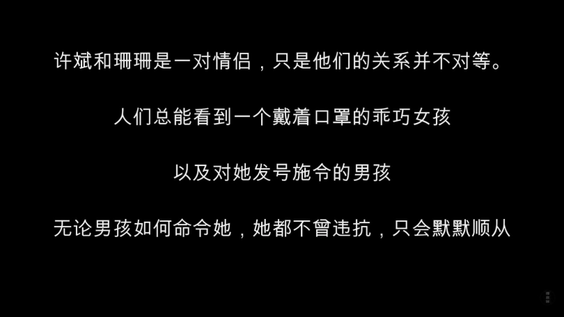 大家都很奇怪,许斌是怎么找到这么听话的女朋友的,让她做什么她都会去做,没有半点怨言,也从未顶撞过他——这是自然,嘴里一直塞着她自己的袜子要怎么抱怨呢?