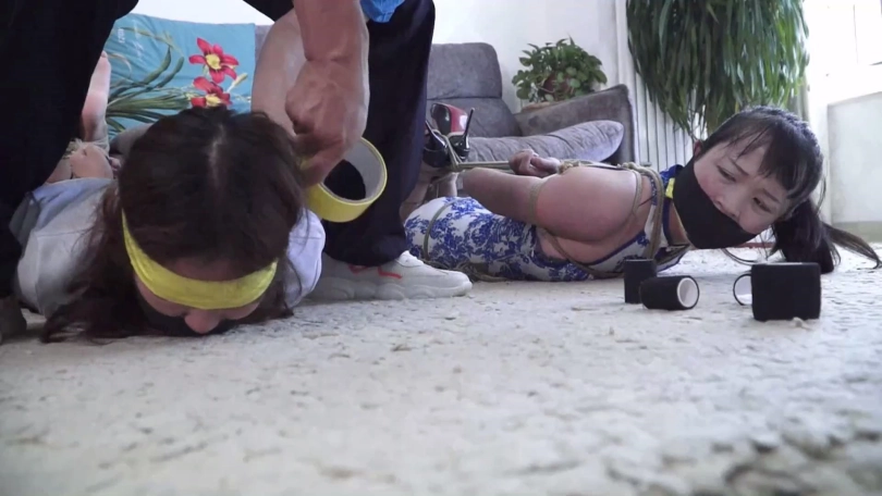 在二女一筹莫展之际锁哥得意洋洋出来,说我捆绑手法不错吧,你们没那么容易挣脱开,现在还有点时间还玩吗,二女拼命摇头表示放弃希望锁哥解开,可锁哥哈哈一笑说你们不想玩了,我还没玩够呢!锁哥将二女捆成驷马放置在沙发前地上,并表示打赌游戏二女输了,就得接受自己的惩罚。