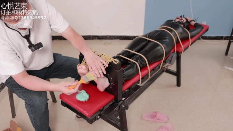 › 【心悦艺束】足控福利,皮革女王老虎凳完全拘束。脚趾全绑,马具口球。绝命TK。