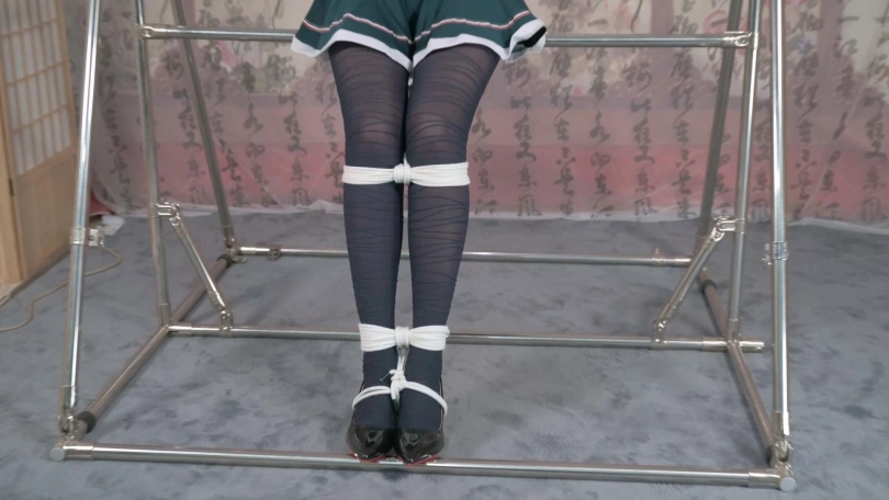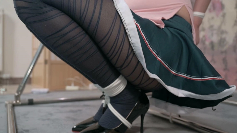 妹子穿上丝袜高跟显得格外修长,先是蹲姿直臂跨过一根横杆固定,然后TK教育,然后换坐姿,便于爱抚长腿,最后的电击让她尖叫连连。