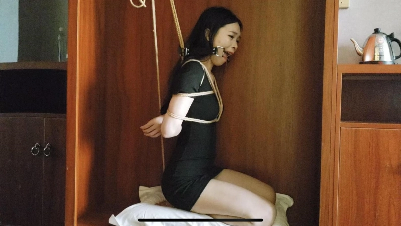 绳命线原创,柜子里的女孩,蓝羽日式绑上后,让她跪在柜子里,把脚和手都吊在了柜子里的晾衣杆上,戴上口枷口水哇哇流个不停,特别是挠痒之后流得更多了挺带感的。