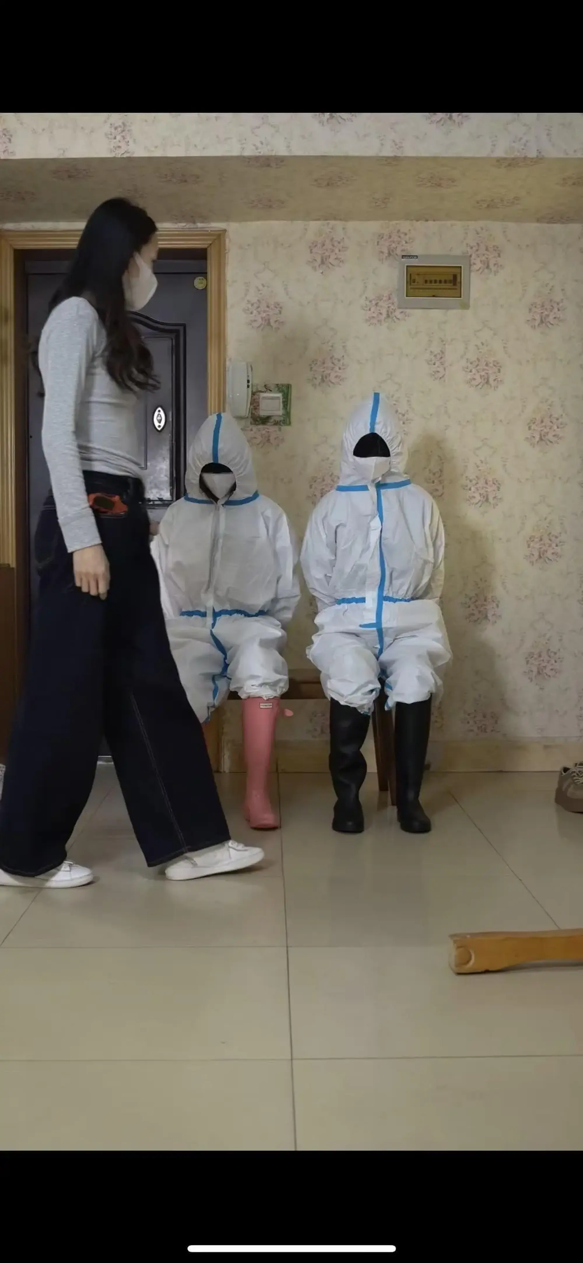 恶女把打扫卫生的工人铐住双手蒙上眼睛,钥匙藏在对方的靴子里,让她们找到钥匙挣脱出来