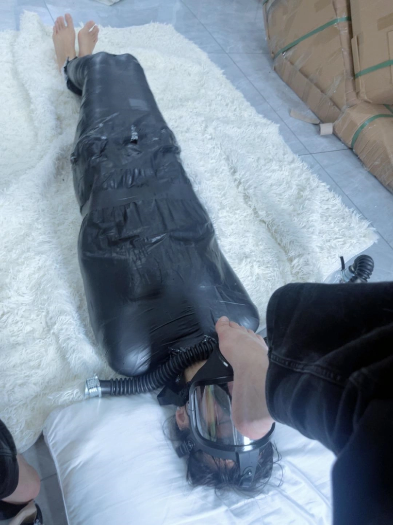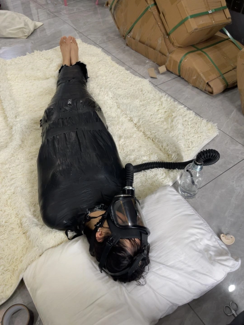 一小时后我才卸下负压瓶,不过还是要用手堵住呼吸孔。就这还不过瘾,我直接用脚堵住呼吸孔,妹子的求生欲使得她为了呼吸还是会继续拼命的嗅闻吸气..嘻嘻!