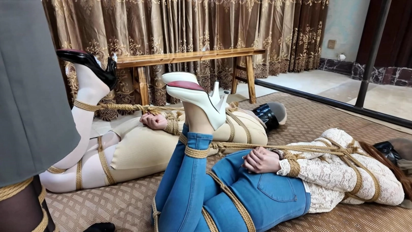 女老总在家中休息睡觉,醒来却发现自己的两个女保镖已经被捆绑封嘴制服,原来是仇家来报复她。所幸对方没有把事情做绝,只是将女老板威胁一番,也捆绑起来。女老总和她的保镖们不断地发出呻吟求救。两位保镖寸步难行,也没有挣扎的动力,只是无谓地发出呻吟声,扭动着身子。女老总奋力挣扎,脚上穿的高跟鞋都掉了下来。