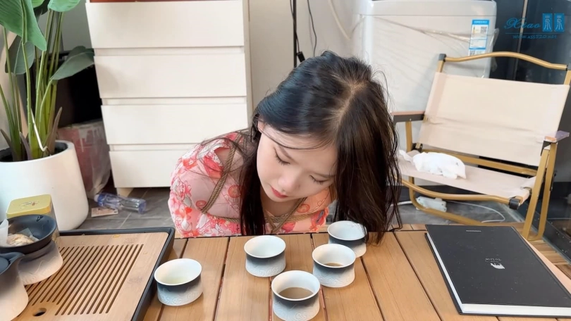 美女模特佳佳粉色和服绳艺品茶