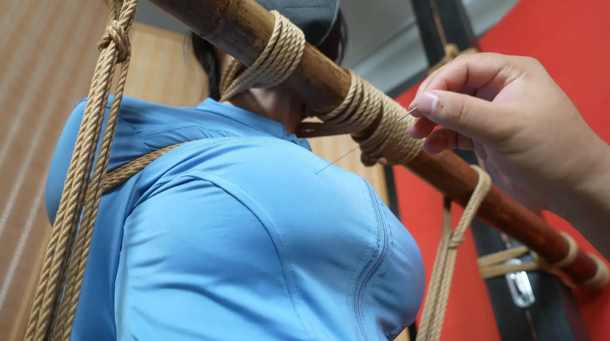 不断地抽打和揉捏嗷嗷的胸部,让嗷嗷不停吃痛哀嚎惨叫,惨得一批。