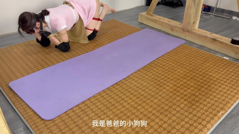 调教爬行了一会,将女友松绑了,女友说:还不过瘾,想被吊起来捆绑双腿垫脚,最后累瘫的趴在男友旁边。