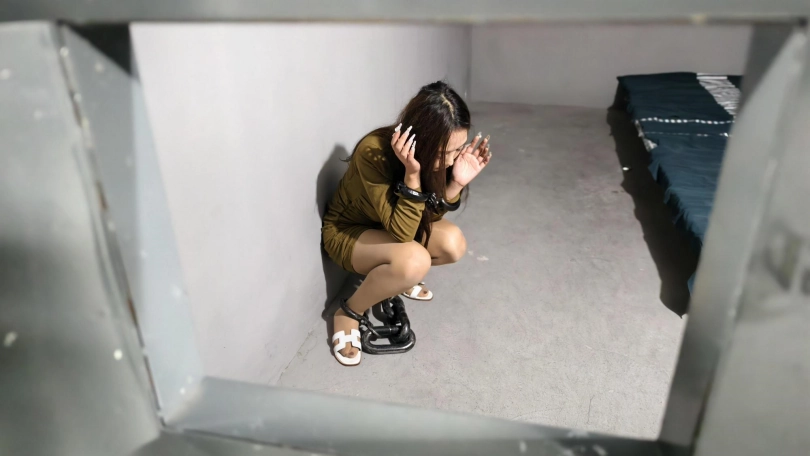 › 【忘忧社】驴驴回归,饰演电诈女犯被抓,带其审讯,指认现场,带连体镣铐重镣,钉死镣死铐,重脚镣,死拷最后被判死刑,五花大绑执行枪决。