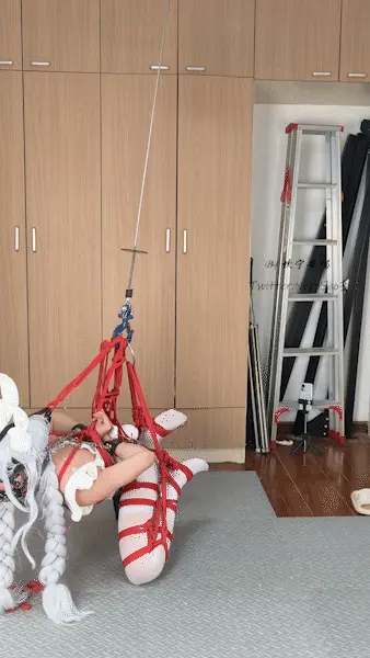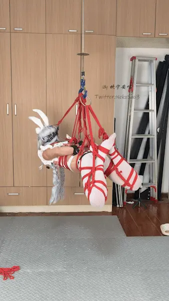 定时自缚吊缚,角色是舰B的兔女郎恶毒,姿势是经典的折腿驷马。起因是看到有小伙伴留言说想看这个角色+这个姿势的复刻,索性就抽空拍一下,但是不得不说这个姿势自缚起来太累了……还因为各种问题重拍了几次,身心俱疲……好在效果还行,唯一的问题是拍摄时副机位忘记切换到超广角导致录出来的画面少了个头,不过应该也不是很影响(?)