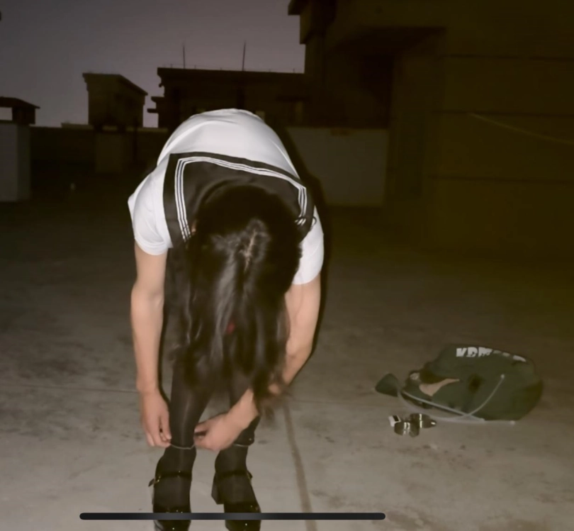 本来只想分别铐住手脚,但是临时起意要自缚就整个刺激的,于是把手铐用定时锁连在一起后,绕过脚铐躺下用极限姿势铐住了双手。刚刚铐住的瞬间非常有束缚感,刚趴下的时候下面也被硌得有反应QAQ!但是接着右手就感觉到麻了,只能不停变换姿势缓解压力,小区天台的门一直在响,特别害怕有人过来因为我这样一点也懂不了一点反抗能力都没有,要是只铐住双手双脚还能跳着躲开,驷马自缚除非到时间否则真的要任人宰割了。