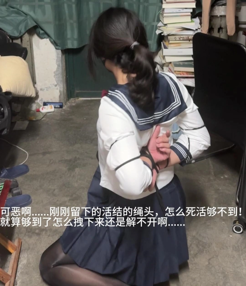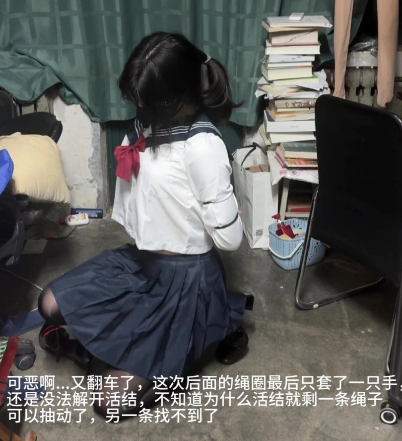 本来想录一个简单的一根绳子的五花后手自缚,再加上定时锁,没想到第一个视频的时候活结就解不开了,而且高跟鞋又特别挤脚,幸好找到了桌子上的小刀才免于一死......后面不信邪,我又重新拍了一次,结果在绑好之后活结还是不开,第一次的小刀我又忘记随手扔到哪里了,以为这次肯定没事的,吓的我把眼罩弄掉,终于摸到了舍友桌子上的一把小刀,还割了两次绳子才把手腕解开…