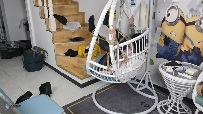 男人将护士绑在里一个吊椅上,脱下她的靴子,亲吻着护士的丝袜美足。男人从衣柜里拿来护士没洗过的丝袜,塞进了她的嘴里,套上丝袜头套,胶带缠绕防止护士吐出嘴里的丝袜。将护士穿过的棉袜放在她的鼻子上,外面戴上口罩固定。用一条丝袜蒙住眼睛。男人开始用棒棒刺激着护士。女护士在这样严密的封堵下只能发出微弱的呜呜声。