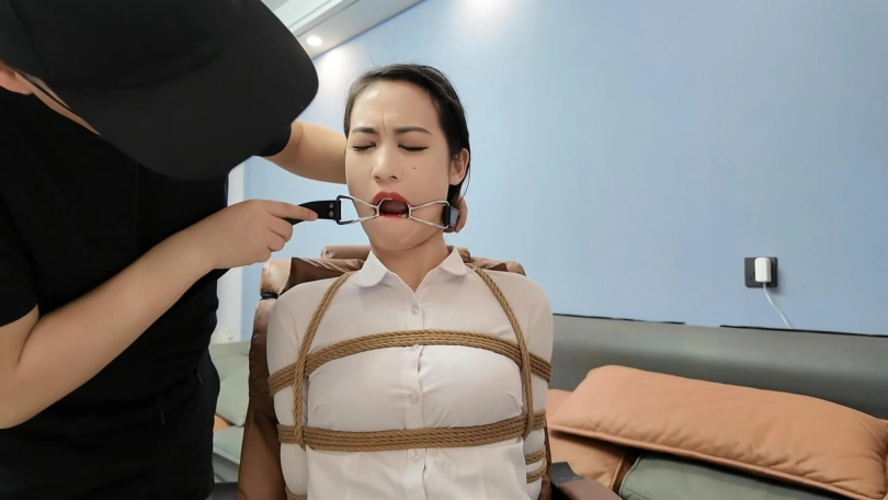 晓倩被后手观音,腿绑到椅子上,绑上股绳玩弄,口球,阳具口塞,口伽,丝袜,各种堵嘴,这是拍摄以来晓倩口水最多的一次,阳具口塞更是干呕不止