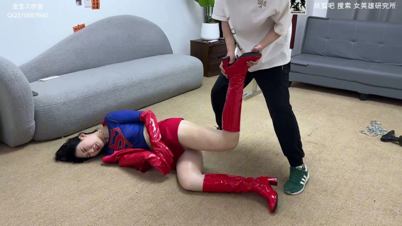 女超人颈间挂着那条暗藏氪石元素的项链,被金属架高高吊起,双臂被缚,初醒时惊恐意识到自己落入陷阱。戴面具的男人以扭曲的狂热围着她施虐,先是殴打腹部、粗暴揉捏大腿、强行掰开双腿拧脚踝,令她痛苦呻吟、身体颤抖。她被折磨的昏厥。短暂苏醒后她切断束缚试图逃离,却立刻被氪石水柱重创,再次陷入折磨,男人揭露自己正是假扮粉丝送她项链的幕后黑手。她拼尽最后力气以魅惑腿部勾引勒颈反击,却被强行掰开双腿,剧痛崩溃,哭腔求饶“住手……求你……我什么都听你的”后再次昏厥。场景转向彻底屈服:男人悠然坐在沙发,手握绳子拽着她颈上的项圈,女超人无力跪地,湿透制服紧贴虚弱颤抖的身躯,曾经无敌的英雄,如今任人摆布、嘴角淌口水。