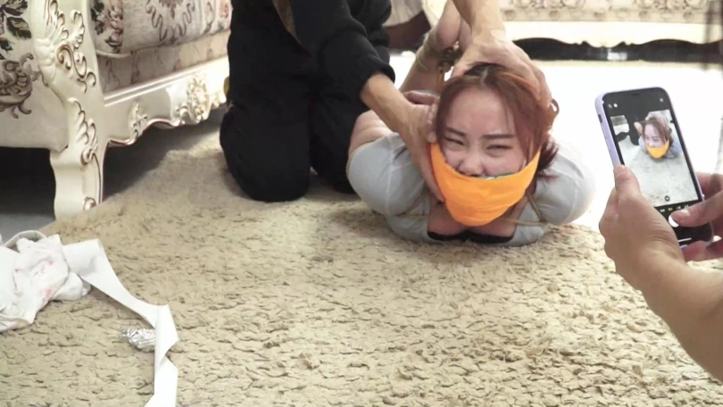 (夏炎与锁哥把想逃跑求救的梁静抓回来,捆成驷马放置在沙发前地上)