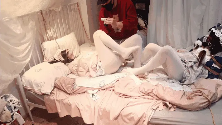 并轻轻了摸了一下粉lo的小玉足害得她惊叫了一声接下来换另一边绑住剩下的两只腿