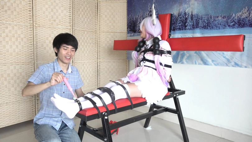 这次是龙女仆里康纳的TK,用了新的老虎凳,还有眼罩和口球,妹子被挠的欲生欲死,就差没哭出来了
