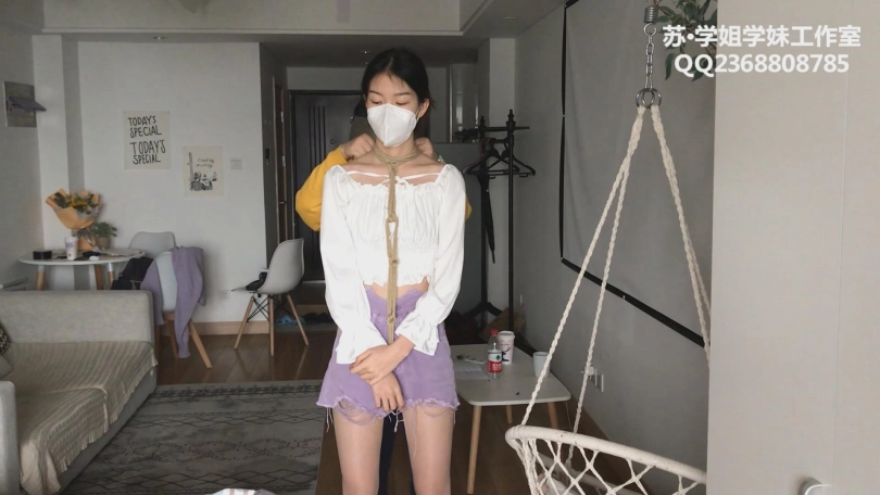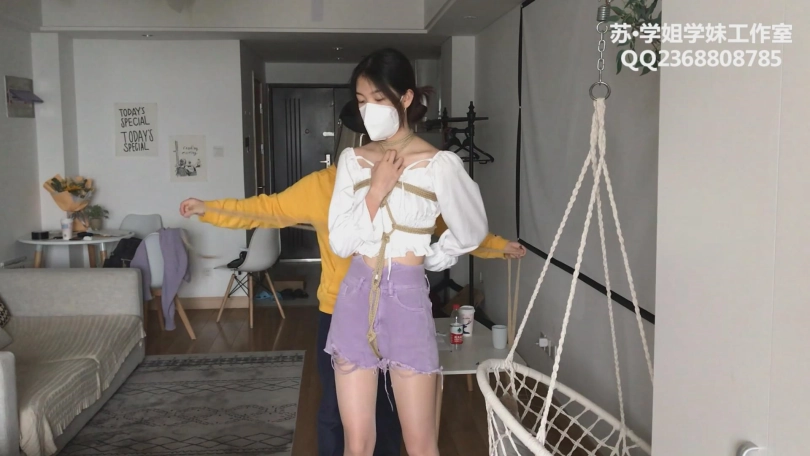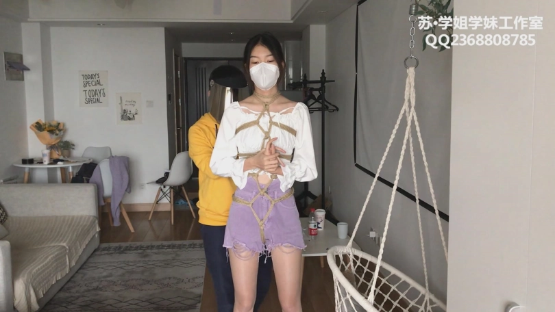 服装是超短裤+马丁靴+闪光肉丝+花边白袜。解语被绑完龟甲后,手臂被五花紧缚,又在沙发上桃缚挣扎,而后脱掉鞋子露出花边白袜,再次桃缚挣扎。