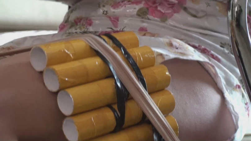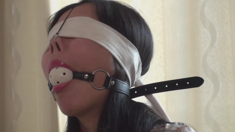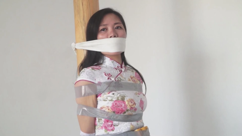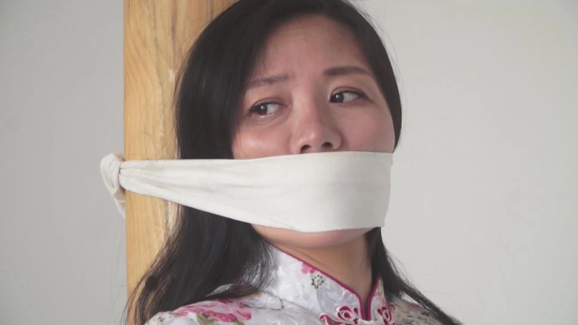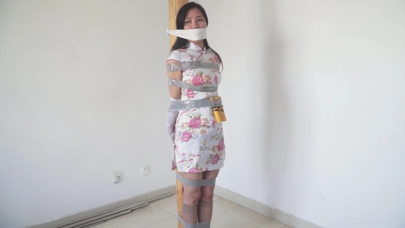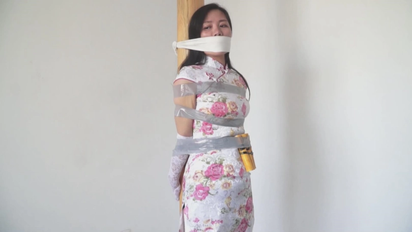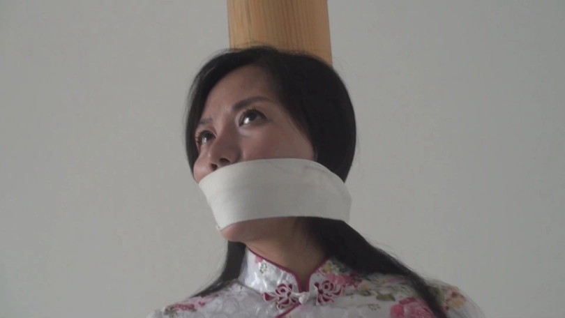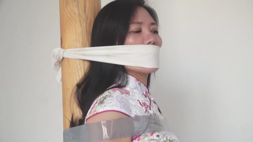 女井林静穿着肉丝袜和旗袍,被匪徒捆绑蒙眼,戴上口球,口水直流。腿上还绑有爆弹。之后又被绑在柱子上,白布蒙嘴。