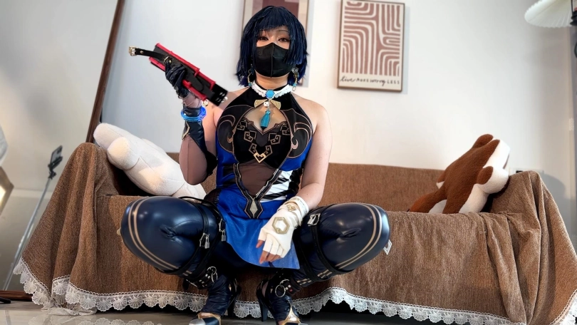 模特雁一cos夜阑进行拘束,开腿束缚带自己上锁,然后双手铐在头后,蒙眼振动玩弄,正片放置双视角