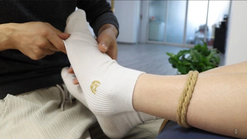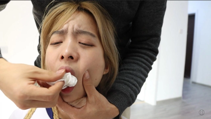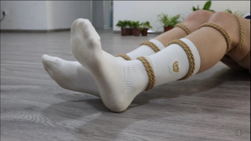 觉醒本性的许斌开始了对珊珊细嫩敏感脚底的TK折磨,被袜子蒙住双眼令珊珊对脚底的感触更加敏感,无论是隔着脏脏的白棉袜挠痒,还是脱掉袜子后用小刷子搔弄裸足,珊珊都只能在浑身拘束中忍耐着,甚至连脚趾都被扎带捆在一起,笑却笑不出声,只得用呜呜声去抗议。最终,被驷马放置的珊珊就这样度过了难忘的一晚。