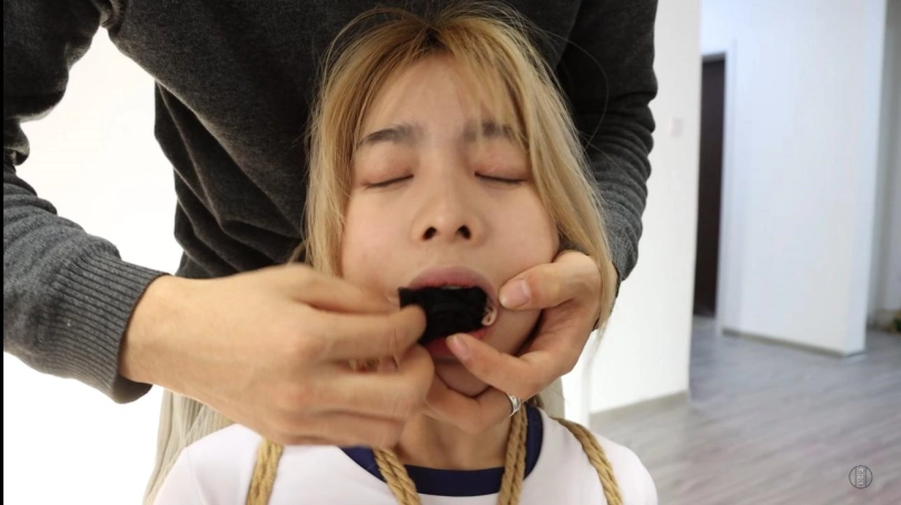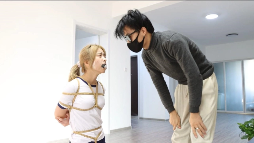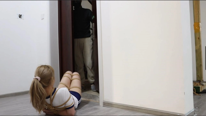 在股绳阵阵牵动下娇声连连,珊珊深知这样下去不是个办法,不打算坐以待毙的她开始了自己的逃亡之旅,窗户是隔音的,即便没有被堵嘴也无法呼救,放弃了呼救的珊珊艰难的蹦跳到客厅,即便身缚重重绳索,忍耐股绳摩擦,她也依旧努力的挪动到了门口,就在即将成功之际,许斌回来了。