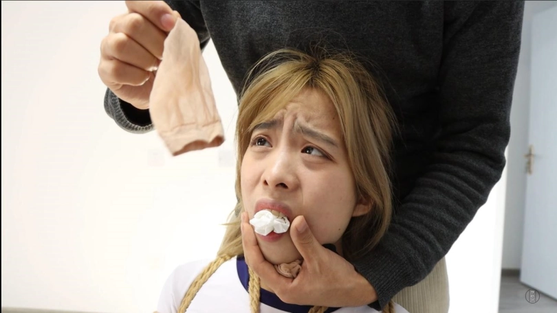 一只运动过后的汗臭白棉袜,一双肉色短丝袜塞满腮帮两侧,最后一条黑色长筒丝袜填满小嘴里的所有缝隙,被极限堵嘴的珊珊鼓起脸颊,透明胶带将三种不同颜色的袜子封在她的嘴里,让她接下来的惨叫也好悲鸣也罢都将转换成‘动听`的呜呜声。