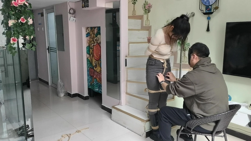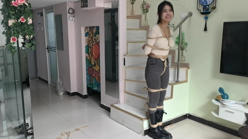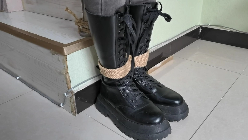 她穿者黑色长靴,上半身日式捆绑,股绳,把她绑在栏杆上固定。然后让她体验挠痒。。。