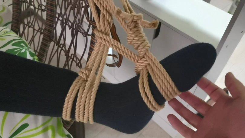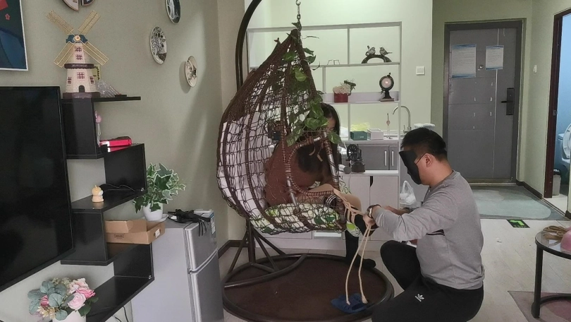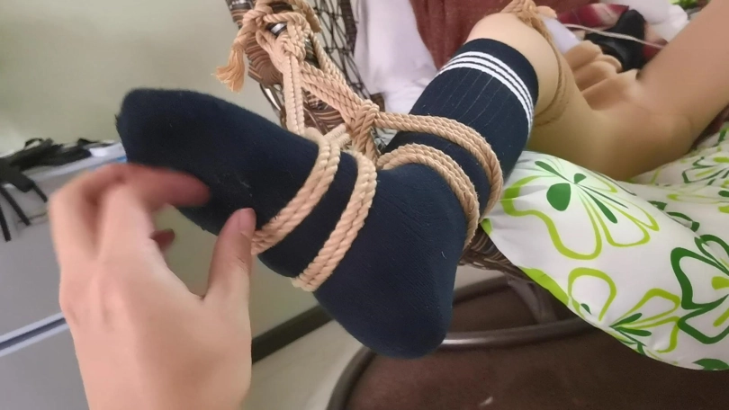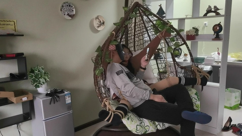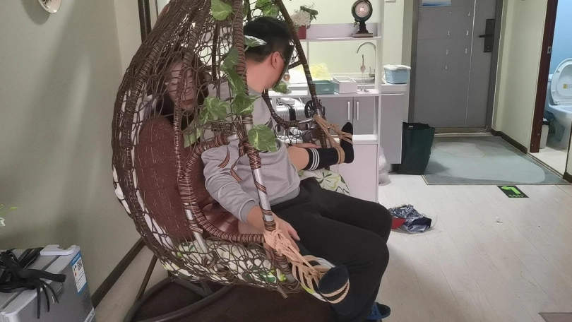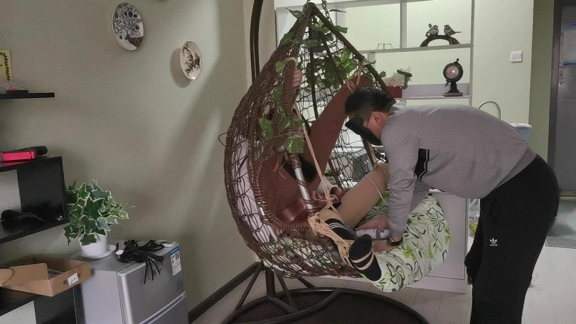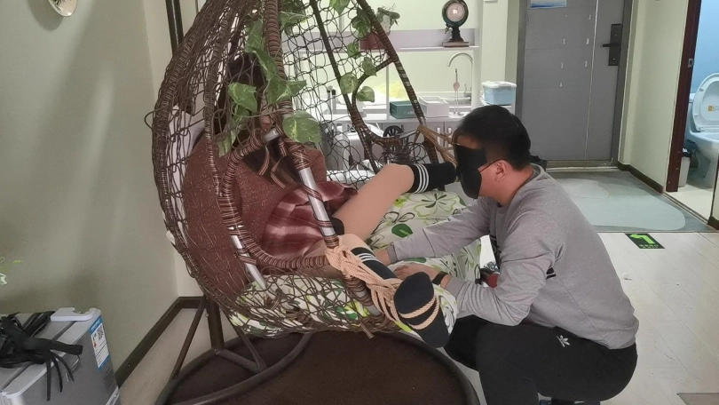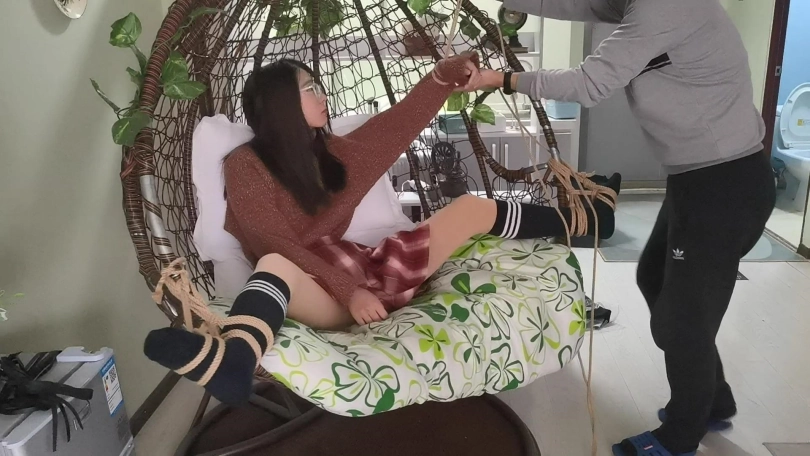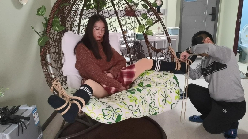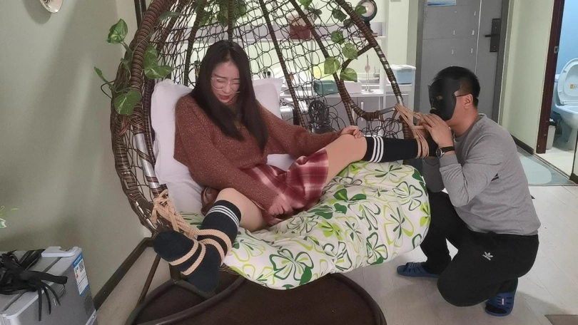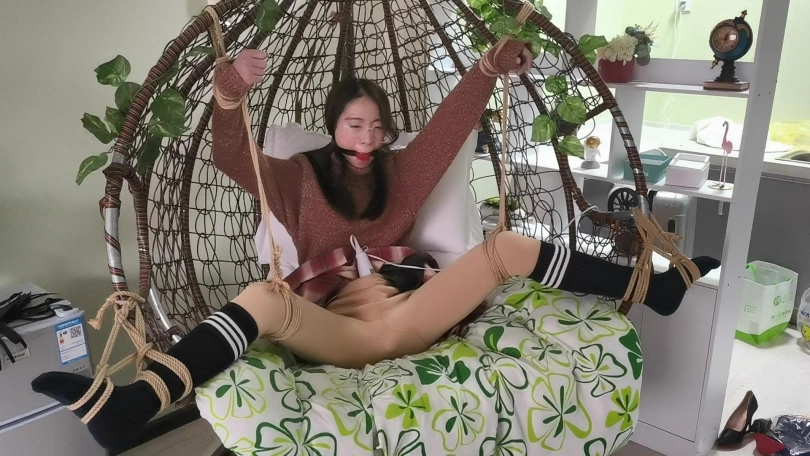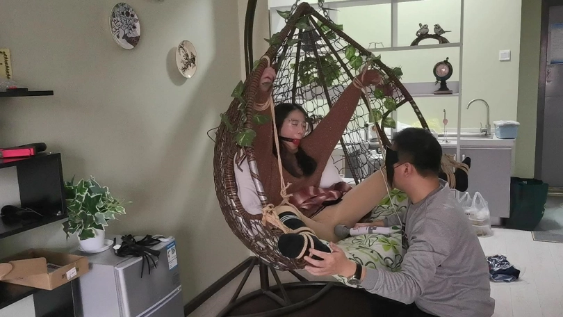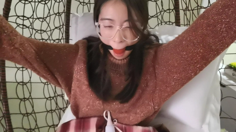采文被绑在摇篮椅上,嘴巴被口球堵上。玩弄她的脚丫。下面放上棒棒刺激着。