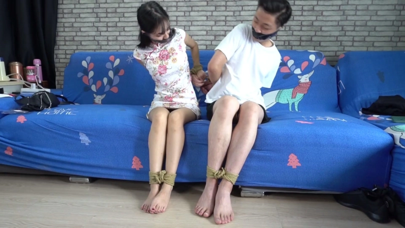 美女珊珊与男友遭劫,二人被劫匪简单捆绑塞嘴封嘴后迷晕放置在沙发上。清醒过来的情侣二人互助解绳,挣脱绳索后撕掉封嘴胶布拽出口中的堵嘴袜子。