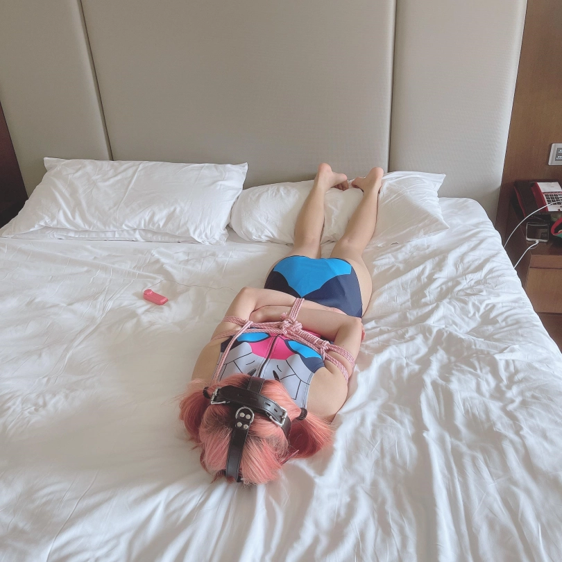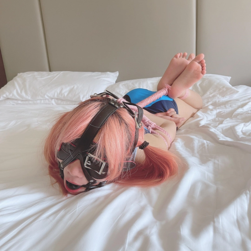 这就是小茶茶的状态:被极限驷马绑的结结实实、连小脑袋都被迫抬起来。硕大的马具口球卡着嘴巴和下把,让茶茶几乎发不出呜咽声、敏感的小脚丫承受着[X_X]的持续刺激,全身又要时不时承受她最畏惧的电击痛苦。