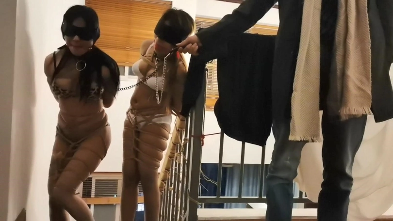 两女被迷晕后被脱的只剩内衣,羞耻的绑在地上,歹徒牵着链子将二女押解到牢房中,二女被绑成驷马放置在桌子上,口水止不住的流出来。
