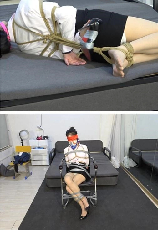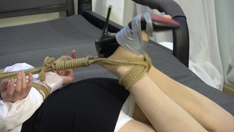 OL装小狐狸被驷马捆绑起来,而能够打开密室门的钥匙被放在她的高跟鞋里,可这只高跟鞋被用胶带固定在她的脚上。千辛万苦拿到钥匙的小狐狸却不能挣脱开捆绑逃生,下场是被绑到一张椅子上,翘着二郎腿束手就擒。