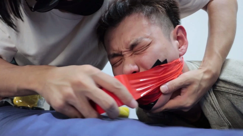 劫匪用黑色电工胶布分别剪下5张封在琪梦表弟和琪梦嘴外,再用红色静电胶带沿二人嘴外缠绕5圈,最后用黄色弹力自粘绷带又沿二人嘴外往脑后缠绕5圈,把姐弟俩的嘴也封得严严实实。