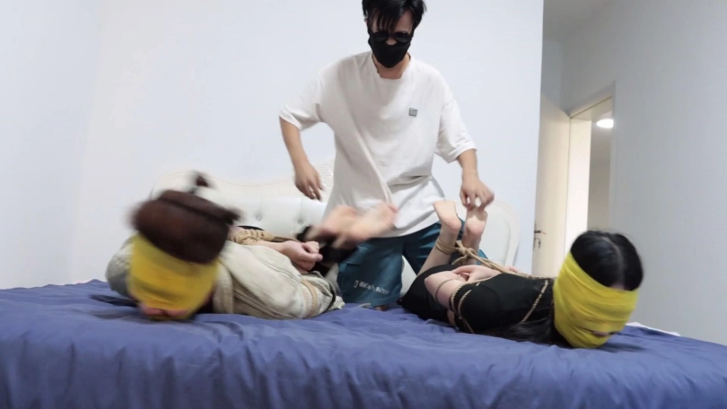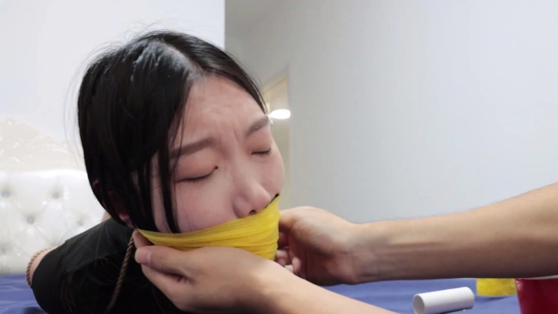 恶趣味的劫匪给床上被驷马的姐弟二人拍照,还故意拿给他们看进行羞辱,姐弟二人愤怒瞪向劫匪,劫匪一看干脆把姐弟俩眼睛给封上,先给琪梦表弟眼睛外用红色静电胶带缠绕4圈,再用黄色弹力自粘绷带缠绕4圈,给琪梦封眼时,琪梦不愿意配合不想闭眼睛,劫匪拿起剪刀威胁说不闭眼睛就把她眼珠子挖出来,琪梦无奈吓得闭眼了,劫匪遂用红色静电胶带与黄色弹力自粘绷带各缠绕4圈。
