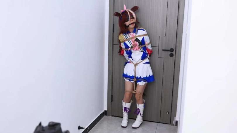 小母马刚刚进门就被挟持晕了过去,等待她的就是绳索的紧缚,但是劫匪似乎有意的疏忽,给她留下了双脚没有束缚。醒来后的小母马万分挣扎总算离开了床上,只可惜刚刚沿着墙边摸索到门口,就被进门的歹徒重新挟持。