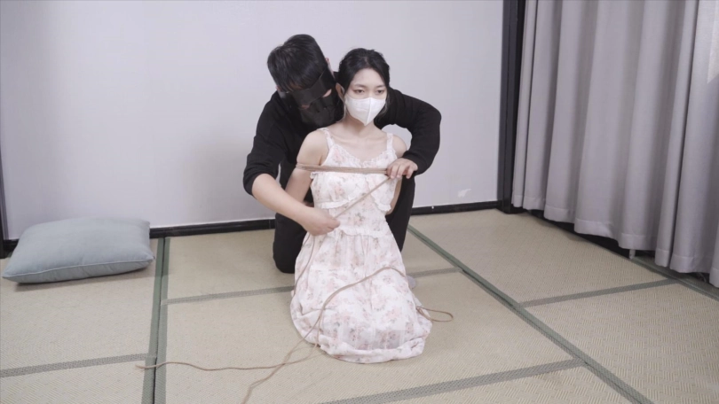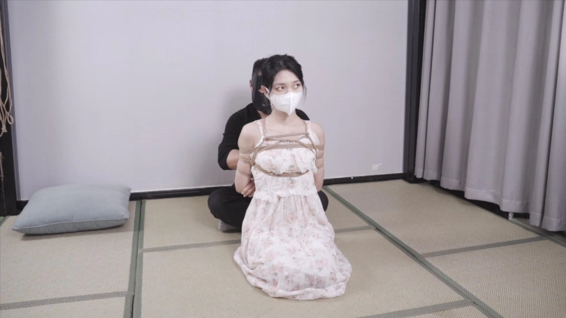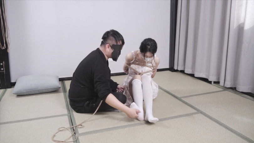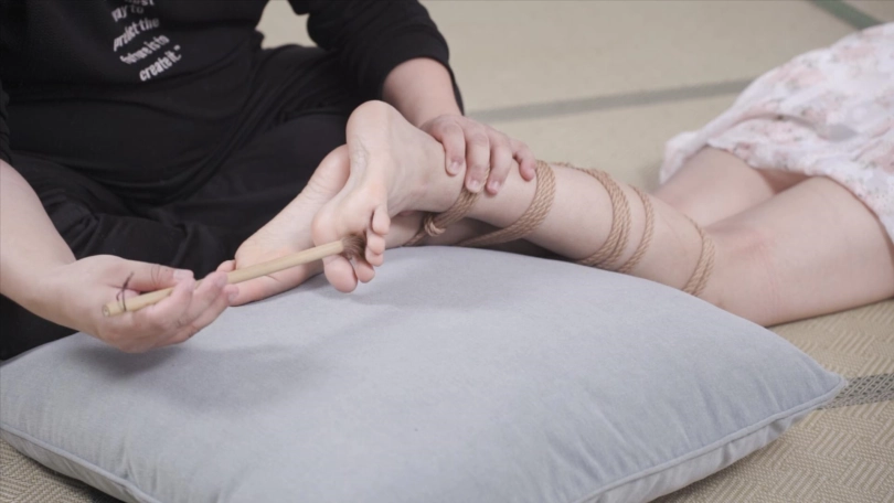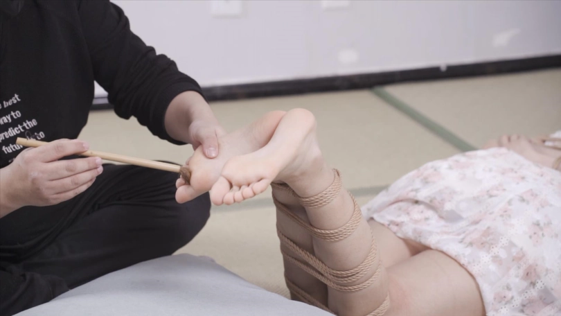 上半身保持日式后手缚姿势,小腿紧缚,开始用毛笔试一下脚上感觉
