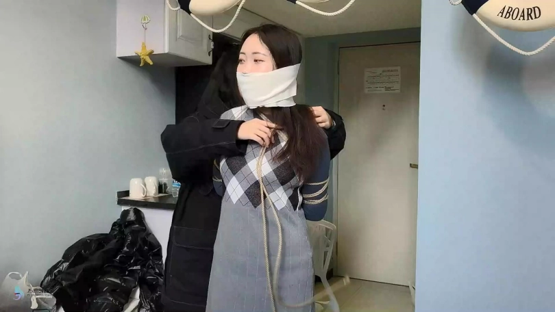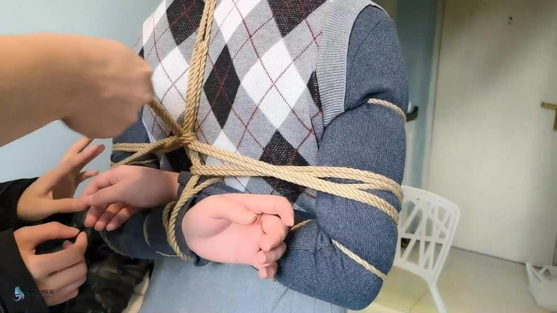 捆绑教程的片子。首先我采用中式变种捆绑将“七穗”捆绑起来。然后让“激辣”给她松绑。并用同样的方式再重新将“七穗”绑起来。嘴巴也用绷带缠绕。。。
