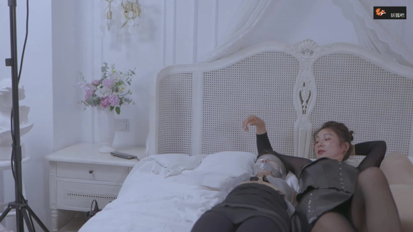 这时,小王的媳妇忽然冲了进来,她一直定位了老公的手机,看到老公去了一家旅馆,就跟来了,然后就看到了老公被虐的场景,还发出享受的呜呜叫。小王媳妇现在也不知道自己是生谁的气,上去就和女老板拼命,两人在被绑着的小王面前打了起来,小王在两双黑丝美腿中间左右摇头呜呜呜叫,也没法帮谁,最后还是小王媳妇被打倒了,被女老板紧紧的绑了起来,还堵住了嘴,让她看着自己虐小王。小王媳妇看到自己老公被虐的那么爽,很是生气,拼命的挣扎,可是无济于事。最后女老板玩腻了,把小王媳妇和小王的眼睛和嘴巴都用胶带封住,嘴巴和眼睛都是绕一圈的那种封,然后抱着她们两个睡着了,三人一起躺在床上,王丽在中间,抱着被捆绑蒙眼封嘴的两人睡觉。两人哪里睡得着,在拼命挣扎,女老板倒是睡的很香......