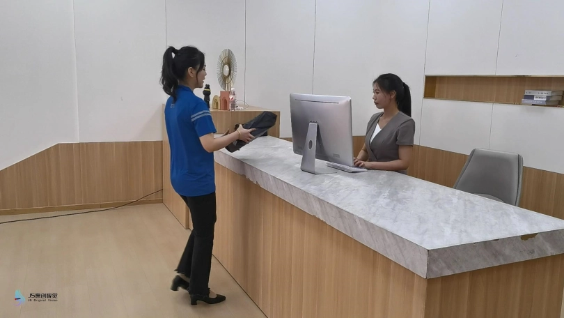 5)在接下来的场景中,抢劫犯穿着接待员的制服配上她自己的黑色高跟鞋,她已经放好了在老板室的桌子下面的接待员。