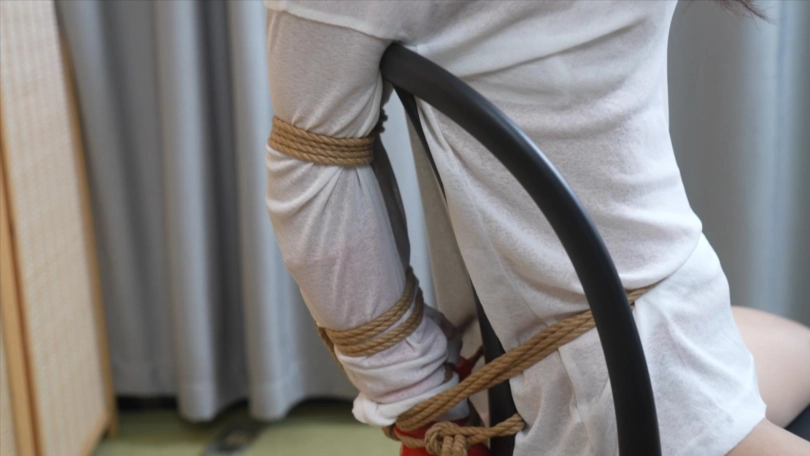 大腿分开,薄纱内裤若隐若现,嘴巴的布条被麻绳牵引,只能头朝后仰