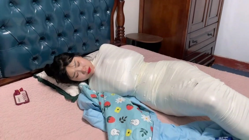 吴晗迷迷糊糊的醒来。发现自己不能动了,她挣脱弄开被子,发现自己的身体除了脑袋都被木乃伊捆绑了。她一脸懵逼从床上坐起来。听到卧室外小偷正在搜刮的声音。原来家里进贼了。