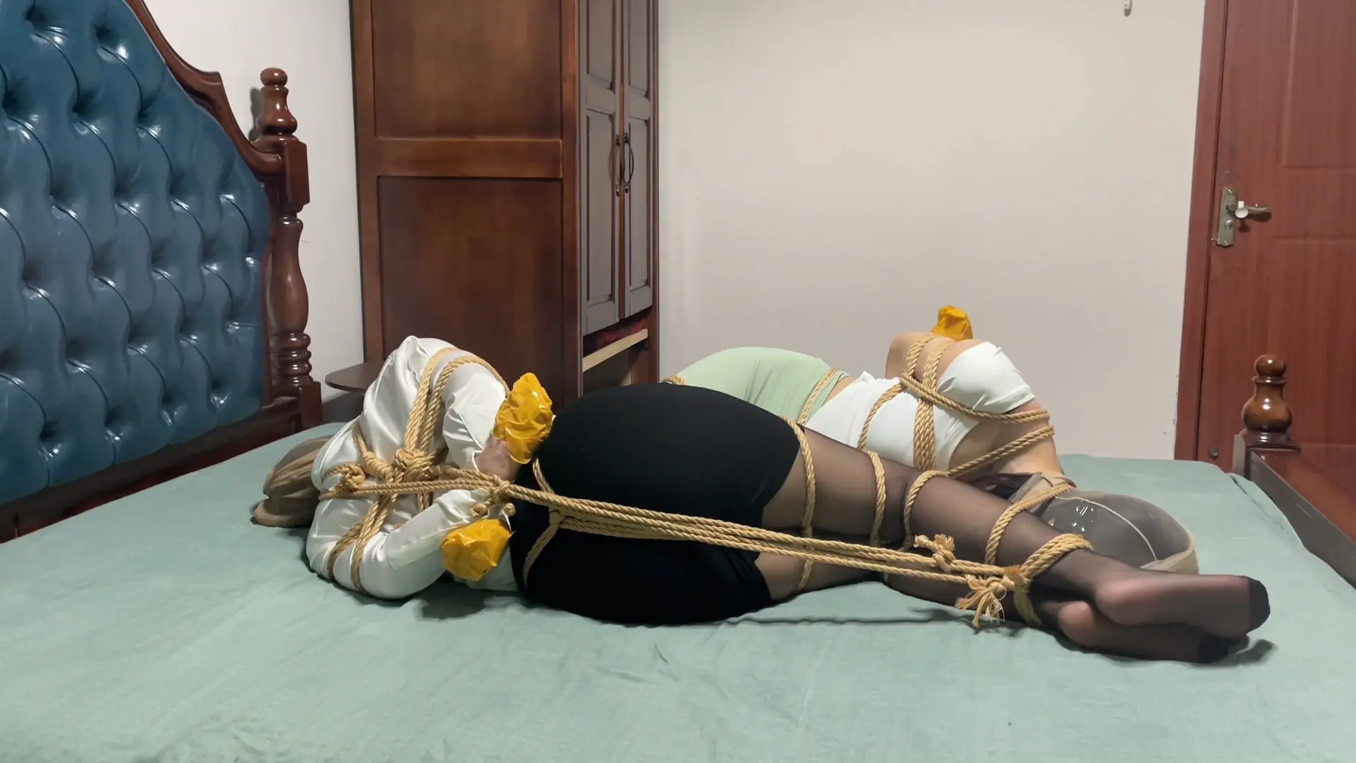 张先生看着眼前的捆绑艺术品深感满意,“仁慈”的他决定让捆绑放置柳洋和李然,让这两位侦探丽人好好感受对方身上的气味。