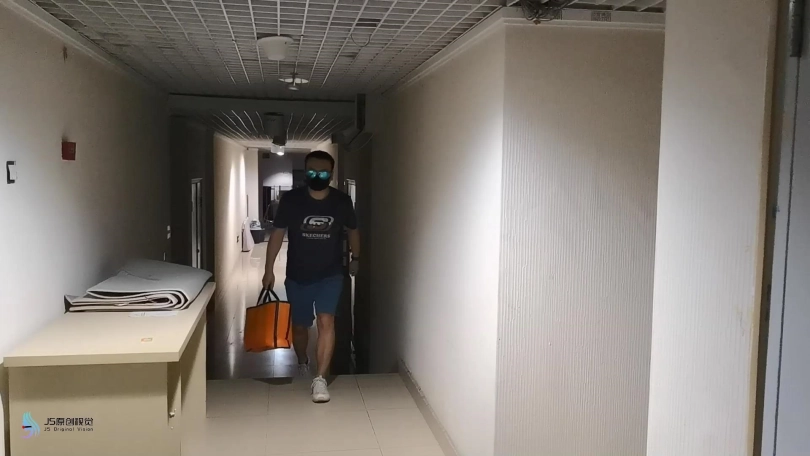 男子假扮快递员手捧纸箱来到模特门前,将一个包装精美的礼物盒放进纸箱后,按响模特家的门铃。模特是一名体操选手,正在家中等待新买的体操服送到,听到门铃声后确认是快递员,打开房门从男子手中接过纸箱,向男子致谢后关上房门,打开纸箱取出体操服,开始拖去衣物开始试穿,换上体操服和裤袜后,模特在穿衣镜前抚摸身体检查,对服装非常满意。
