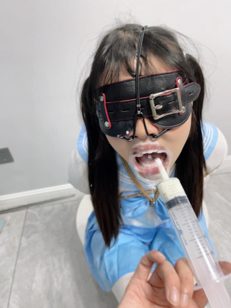 用鼻饲针筒抽出牛奶,塞入妹子的鼻孔里,用最大力气按压针筒,让牛奶喷射进妹子的鼻孔,从口腔流出。