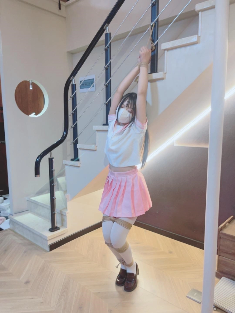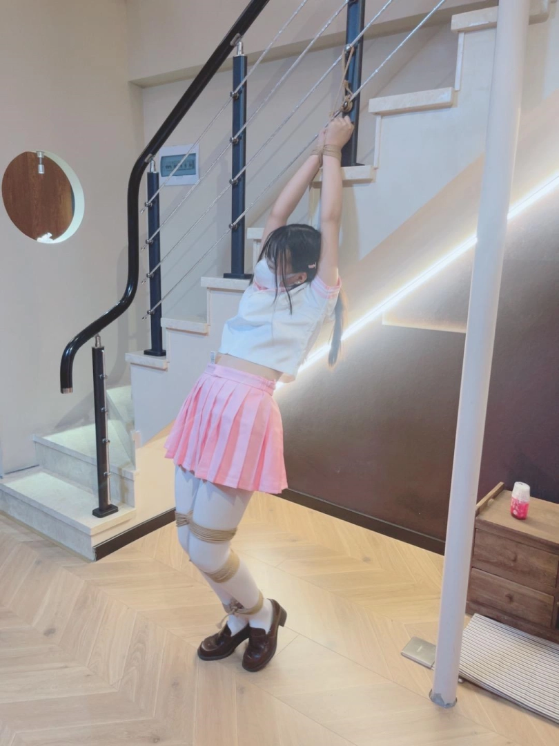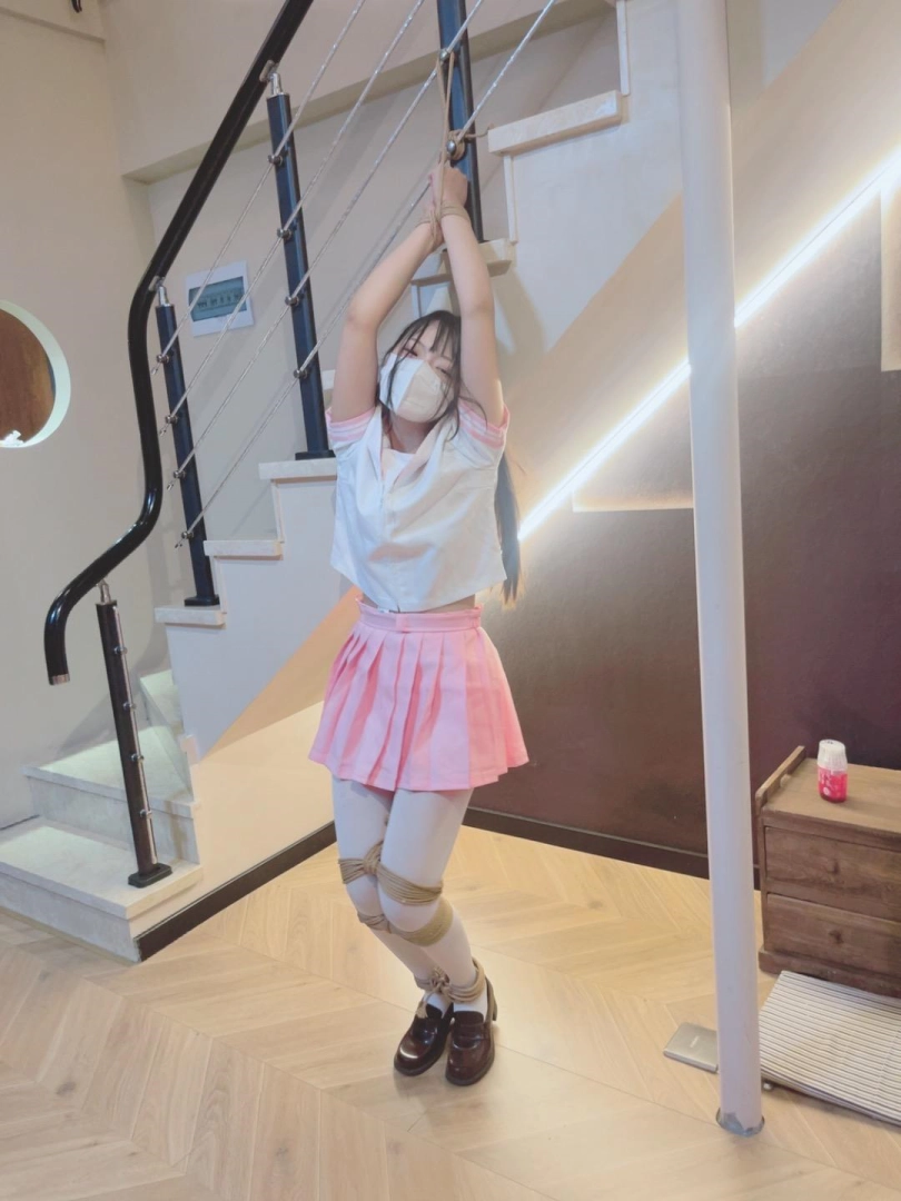 让糖糖穿上可爱的粉色jk制服,穿上jk小皮鞋(这短暂的换装时间也是她唯一能休息的时间了),然后用多道绳子紧紧拘束大腿、小腿、脚腕。然后把手腕拉到最高,直到强制踮脚脚尖才能勉强接触到地面为止。如果放下脚,绳子就会狠狠勒紧手腕,并且手臂承受全部体重~算是个简单的predicament吧~