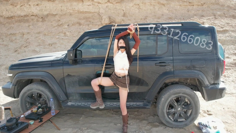 开到无人区这么荒无人烟的地方,怎么能不安排一场刺激的捆绑呢,无人机飞起来的那一刻正片就开始了,把m捆绑好之后,自己跑去喝茶,这么美的环境还是很有感觉的,感觉地球上就剩下她一个人了,而且还被捆绑着,这可怎么办