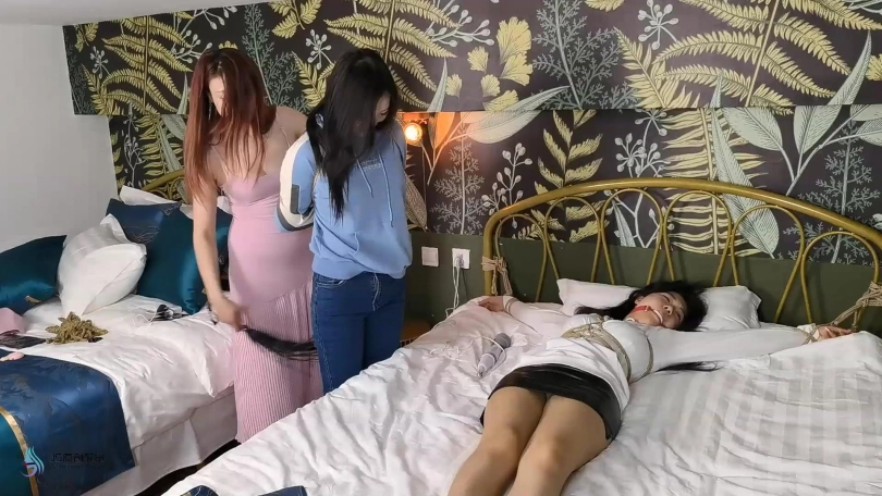 女劫匪扛着晕着的女孩放到床上,上身龟甲捆绑并大字将她绑在床上。女孩醒来,女匪说:“我再问你最后一遍钱在哪里?”但女孩还是不说,随后女匪用鞭子抽打她,后面索性将女孩的丝袜撕烂。随后继续用棒棒进行刺激,然后脱掉了女孩的靴子和丝袜。女孩觉得很羞耻,被脱掉袜子后将两腿夹紧。这时女匪扛着女孩的闺蜜归来,她将一个TD放进闺蜜的裆部,并抽打着闺蜜,一边对女孩说:“再不说,就让你闺蜜替你受罚。”