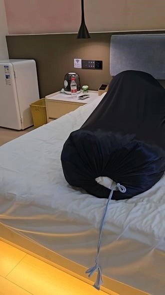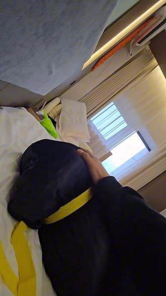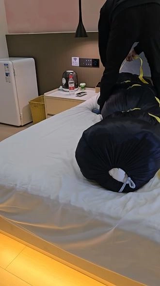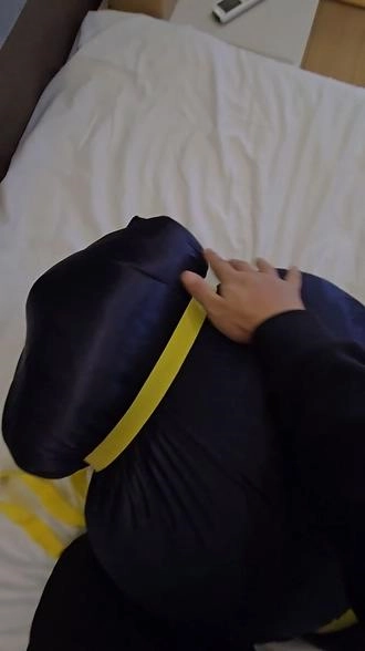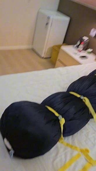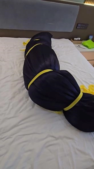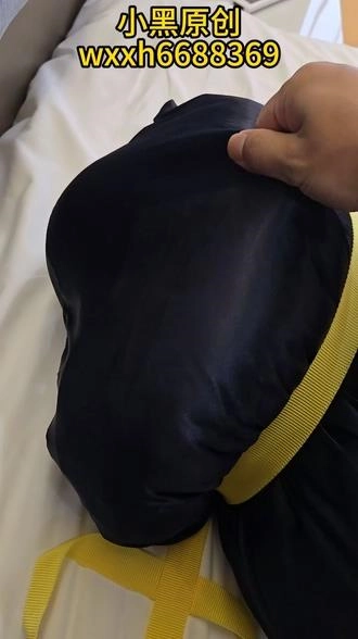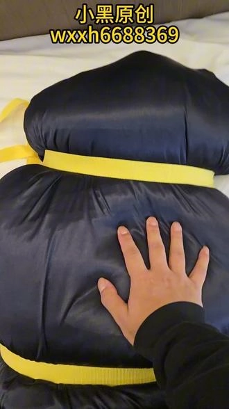 【小黑】戴上手铐,再用棉被全包,再装进丝袋,再用收紧带捆上,这次双手完全无法挣扎,头部勒得很紧,超难受。