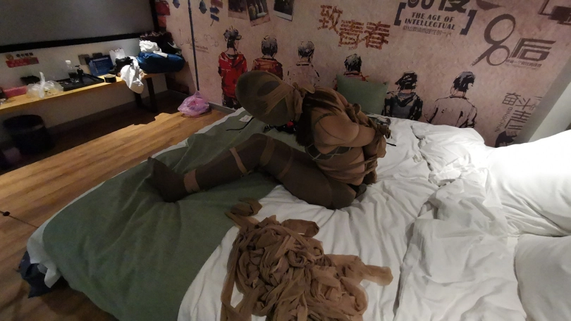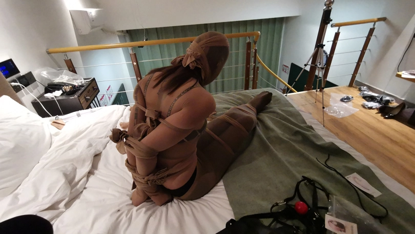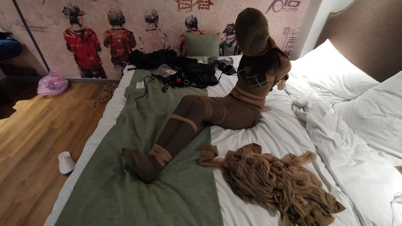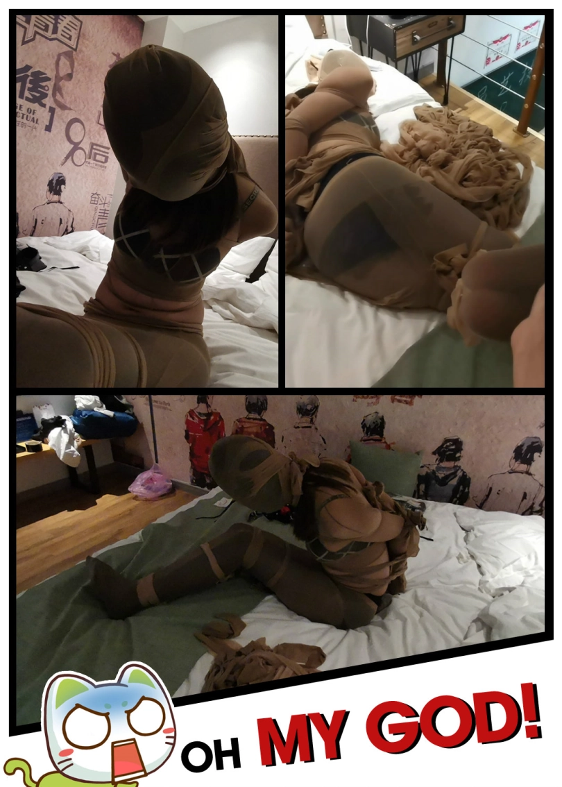 用一条肉丝单腿将瑾萱双腿套上,再用一条肉丝裆部剪开当衣服套上。瑾萱用几条肉丝把自己双腿绑上,再用几条后手直臂捆紧,头部也给套上一条肉丝。本来觉得肉丝捆绑应该比绳子好点,但实际是也挺痛苦,后期瑾萱已经开始发出痛苦的呻吟,痛苦的表情通过薄肉丝若隐若现。时不时挠下瑾萱的脚,双脚在袜子里束缚着,无助的扭动。。